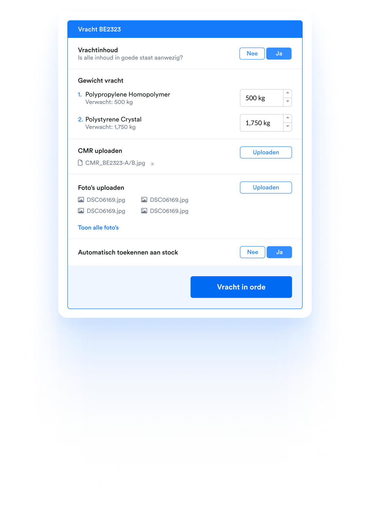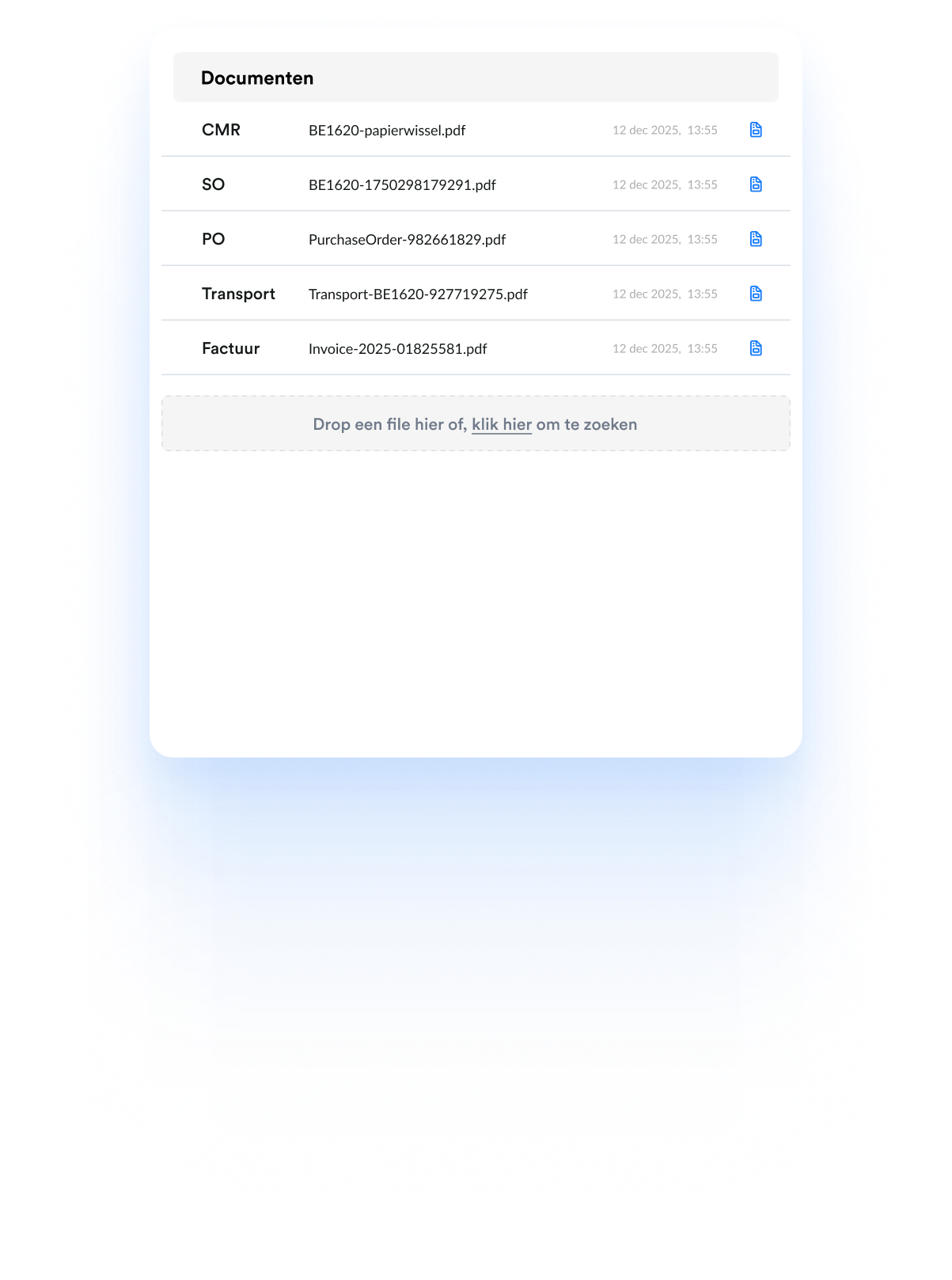 Contracten, facturen, transport- en douanepapieren automatisch gegenereerd en volledig traceerbaar.